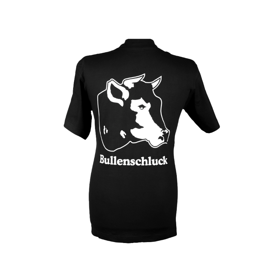 Männer T-Shirt in der Farbe schwarz. Auf dem Rücken befinden sich ein großer Aufdruck des original Bullenschluck-Bullenkopfes und darunter der Schriftzug „Bullenschluck“.