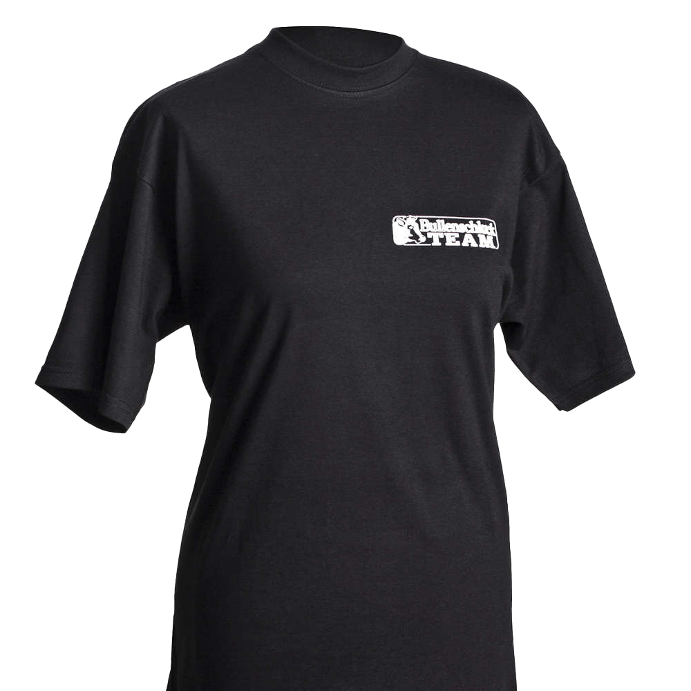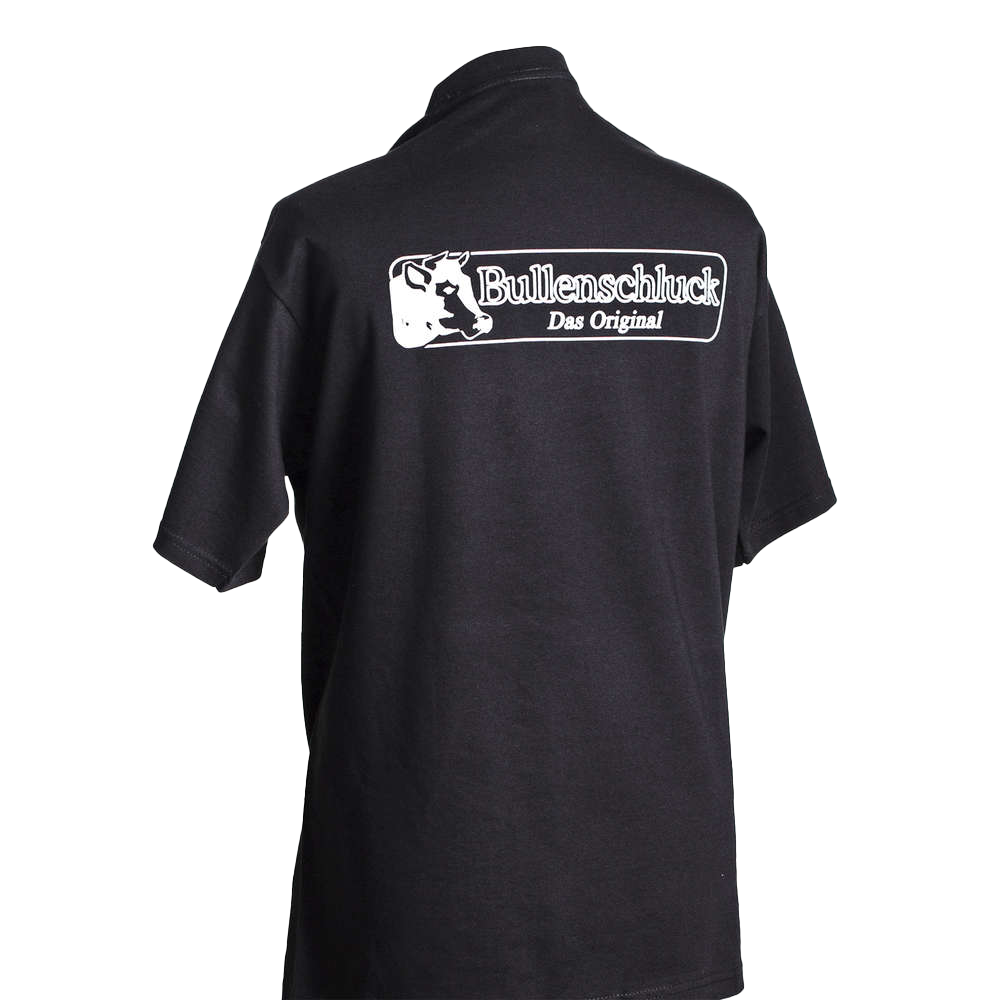 Männer T-Shirt “Topline” in der Farbe schwarz. Das T-Shirt hat auf der Vorderseite die Aufschrift “Bullenschluck Team” und auf der Rückseite “Bullenschluck Das Original” stehen.